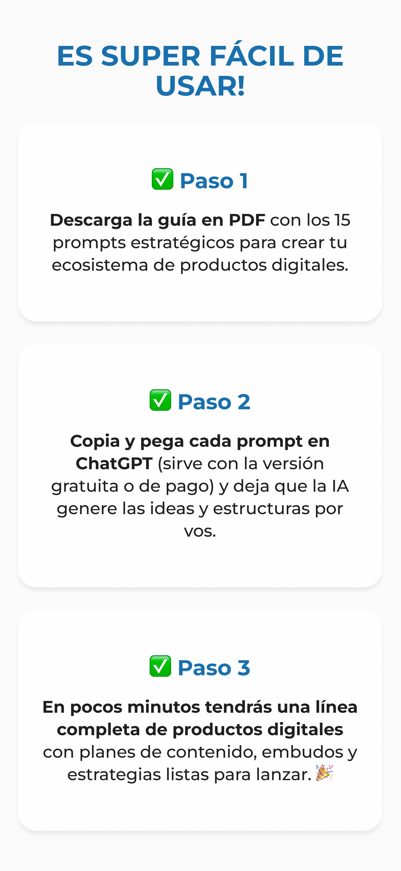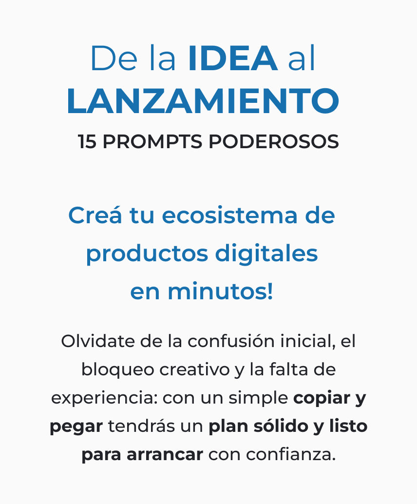 Estos prompts están diseñados estratégicamente como un ecosistema de producto digital, no como frases sueltas. Cada prompt se conecta con el siguiente, guiándote en un proceso paso a paso.